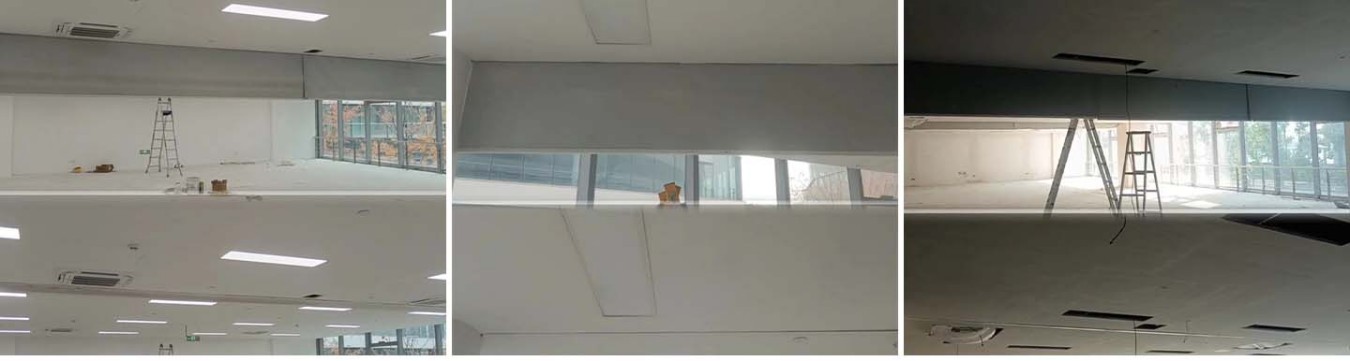 2、不降低建筑高度:卷帘式设计,平时收起在吊顶内,只有应急情况才会下降,不会降低建筑高度,普遍适用于一些吊顶高度低于3.2m 及对使用高度有要求的工程项目。