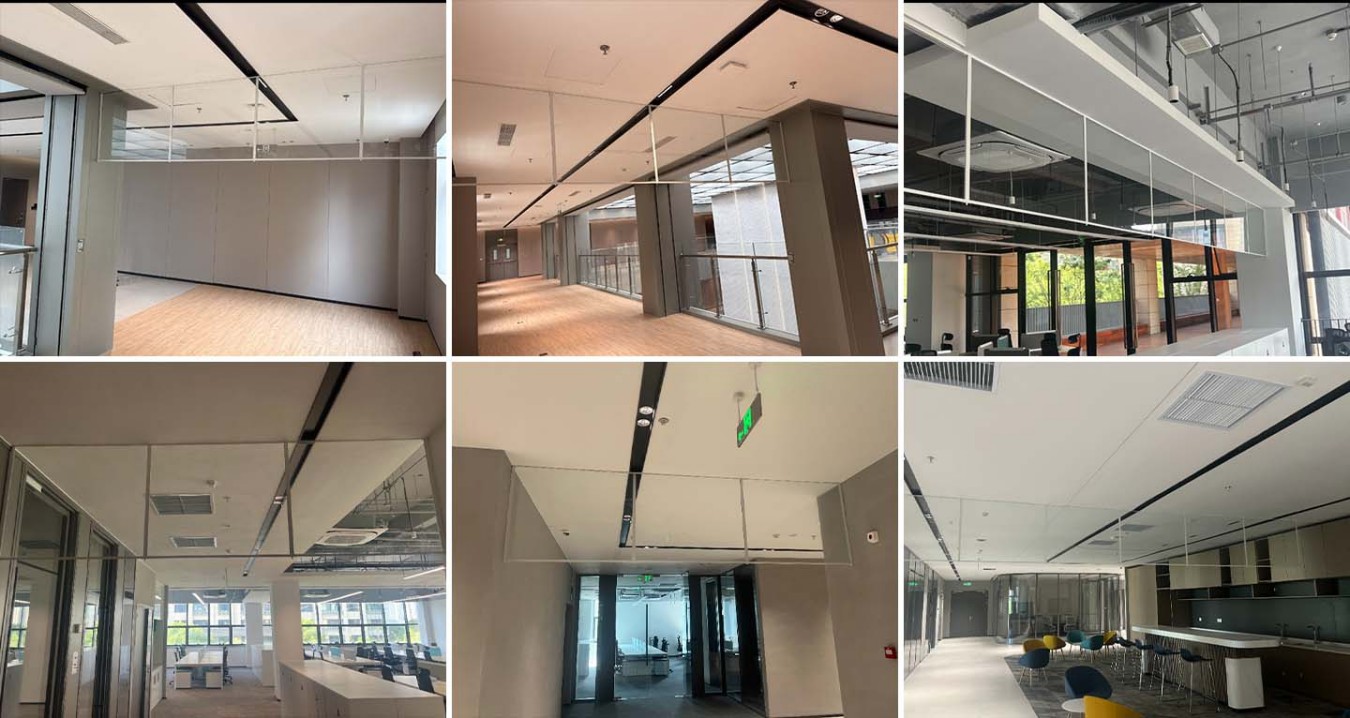 我司为昆山全球数字创新港北区项目供货并安装固定式刚性挡烟垂壁,采用全框式玻璃挡烟垂壁,裸顶区由精装修单位制作倒挂梁,倒挂梁下面安装玻璃挡烟垂壁。