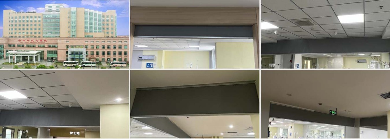 昆山宗仁卿纪念医院选用恒开利挡烟垂壁,材质为:玻璃纤维长纱防火布+液体硅钛防火涂层,涂布成型厚度约0.48mm,颜色:灰色。边框:镀铝锌0.6mm压条+0.6mm辊压T型下轨(底梁)。