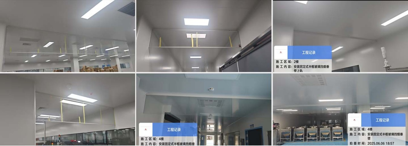 浙江佐力药业选用了恒开利品牌的固定式刚性挡烟垂壁(半框透明6mm防火玻璃),共计49跨,长度220米。